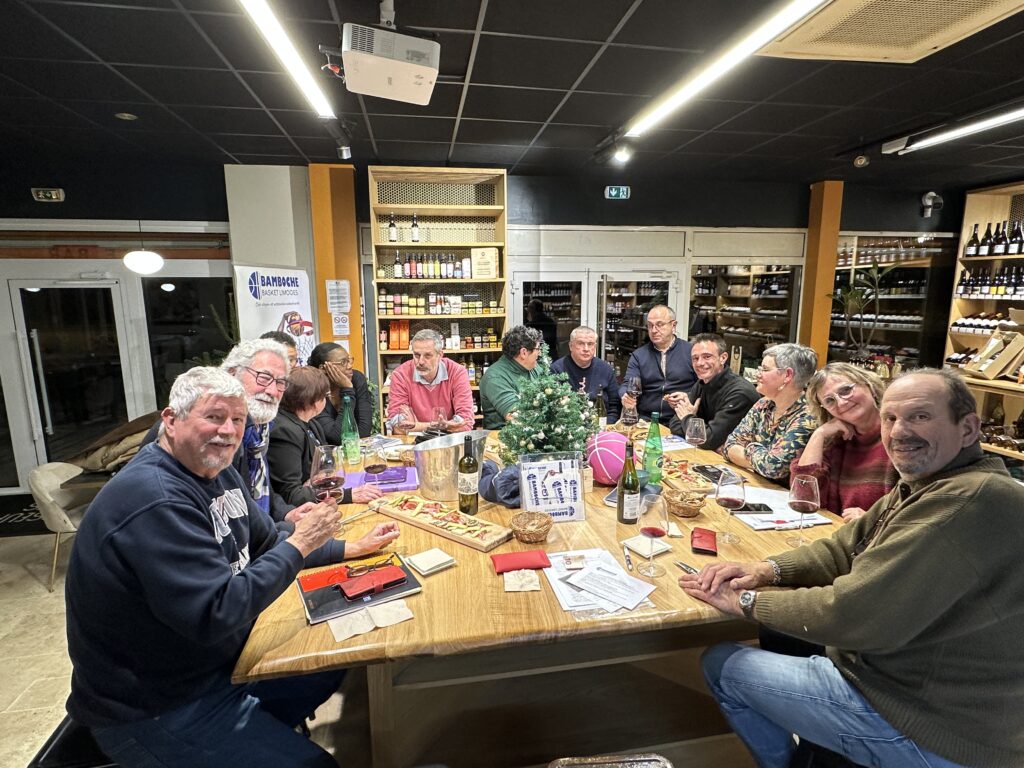 La soirée était organisée chez « Chasseur de crus » autant dire des spécialistes du réconfort après l’effort. C’est un exercice qui nous convient et nous avons fait honneur à la maison. Bonnes fêtes à toutes et tous, rendez-vous en 2026 et vive le basket 3×3 et la citoyenneté active.